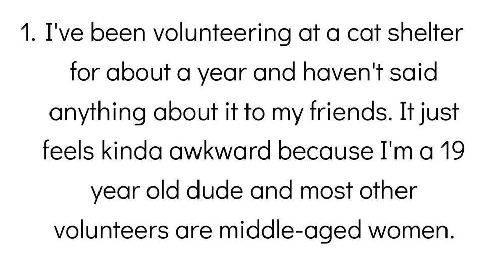 I've been volunteering at a cat shelter for about a year and havent said anything about it to my friends. It just feels kinda awkward because I'm a 19 year old dude and most other volunteers are middle-aged women lol.