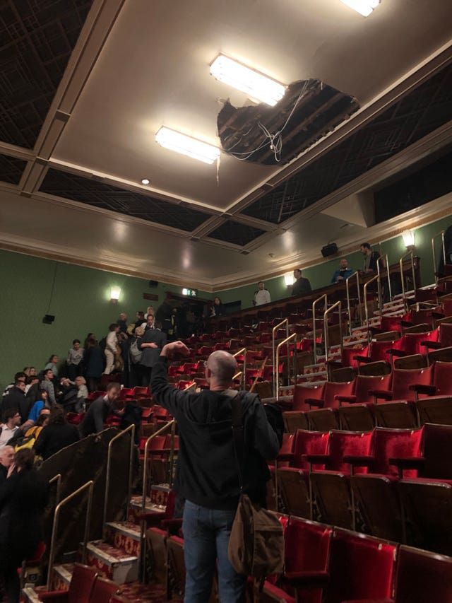 The Piccadilly Theatre in Denman Street in central London was evacuated and emergency services called shortly before 8pm on Wednesday after part of the ceiling crashed down into the auditorium during a performance of Death of a Salesman.