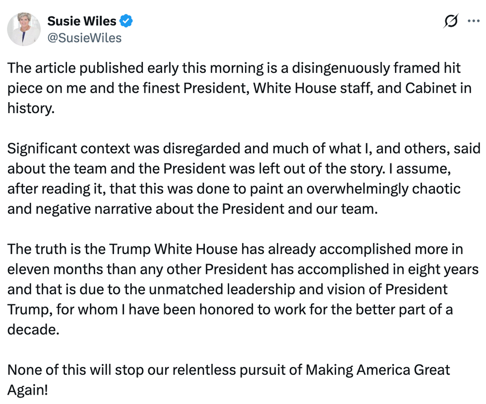 Wiles herself asserted that "significant context was disregarded and much of what I, and others, said about the team and the President was left out of the story." Attorney General Pam Bondi also backed up Wiles, saying that "any attempt to divide this administration will fail. Any attempt to undermine and downplay President Trump’s monumental achievements will fail."