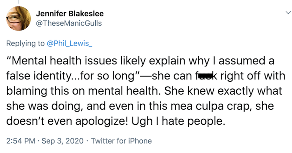 "But mental health issues can never, will never, neither explain nor justify, neither condone nor excuse, that, in spite of knowing and regularly critiquing any and every non-Black person who appropriates from Black people, my false identity was crafted entirely from the fabric of Black lives."