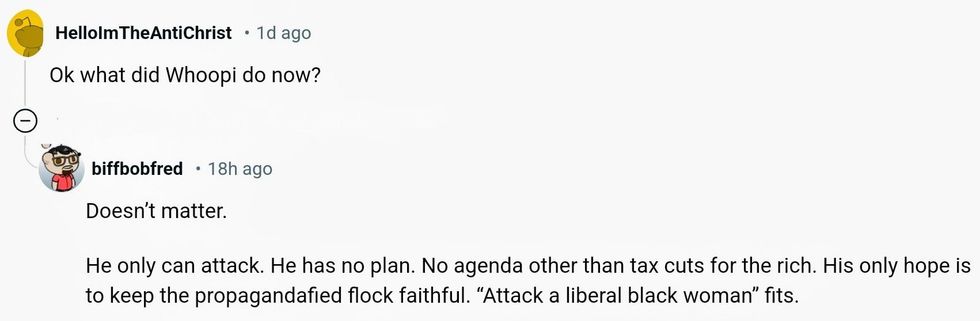 On Monday's episode of The View, host Whoopi Goldberg addressed one of former Republican President Donald Trump’s latest social media tirades.