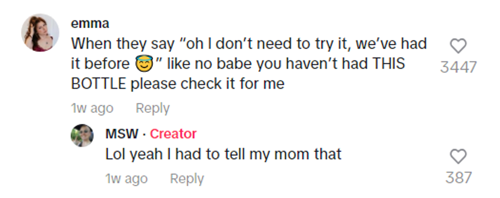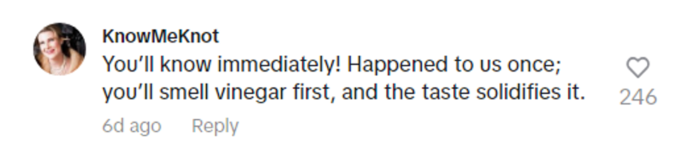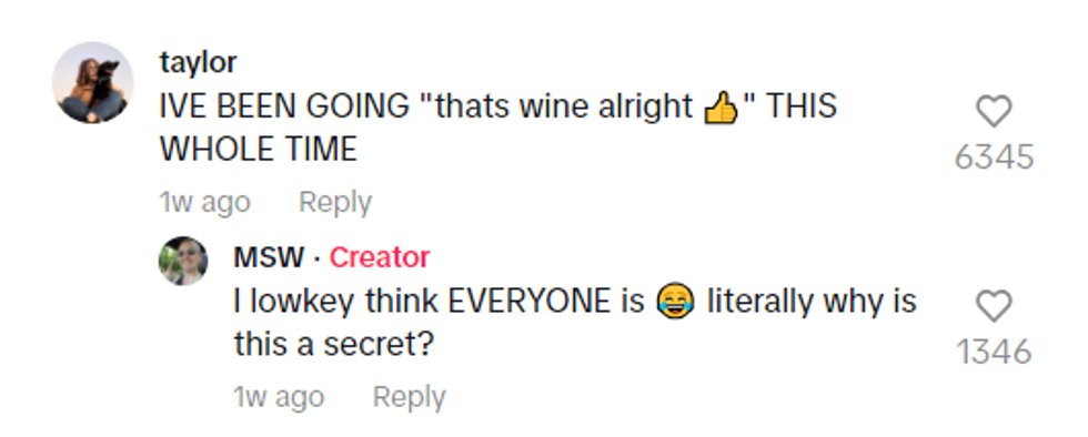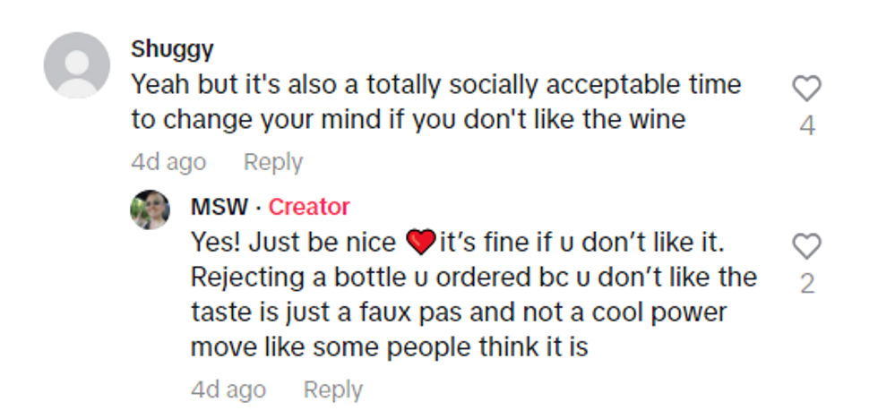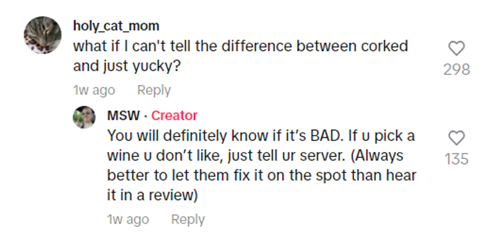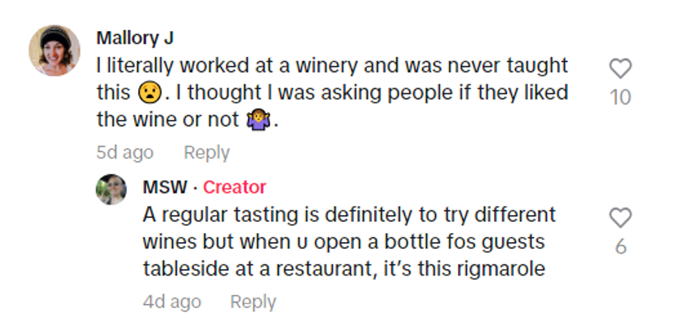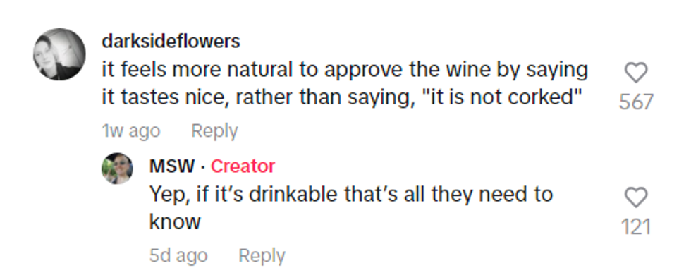The TikToker coaches viewers to always try the wine before the server leaves the table, just to make sure the wine is still fresh. What can happen is mold can develop on the cork and sour the wine, which is called "corking."