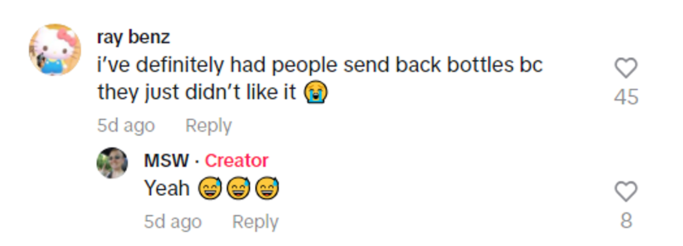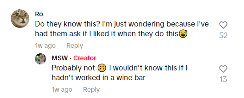 The TikToker reassured concerned viewers that, while this process is in place to avoid customers drinking bad wine and becoming ill, servers and restaurants still care about their customers' experience and and want them to enjoy the wine they've ordered.