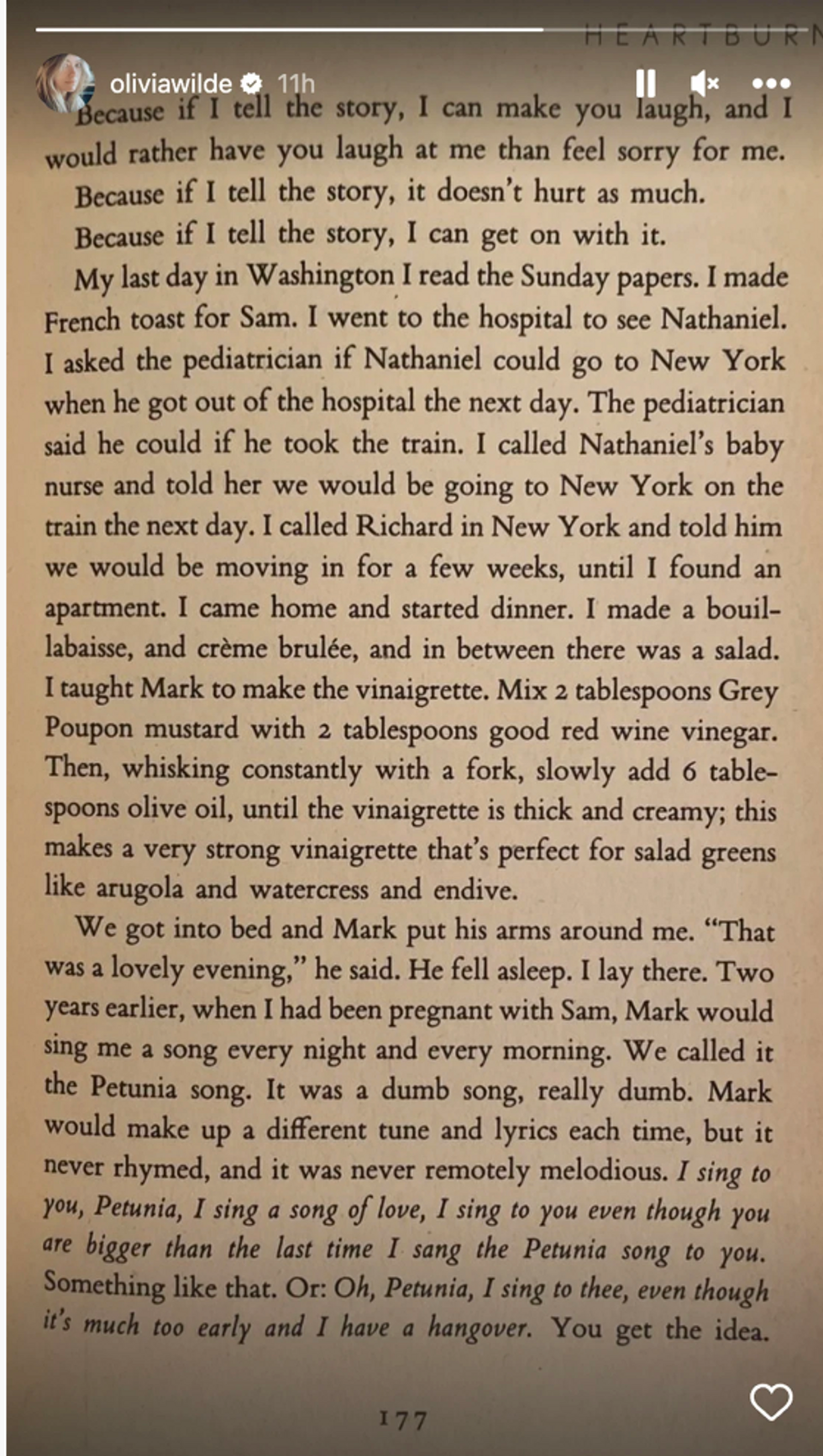 On her Instagram story, Wilde posted a picture of a page from Nora Ephron's book Heartburn which held the secret to yesterday's Twitter storm.