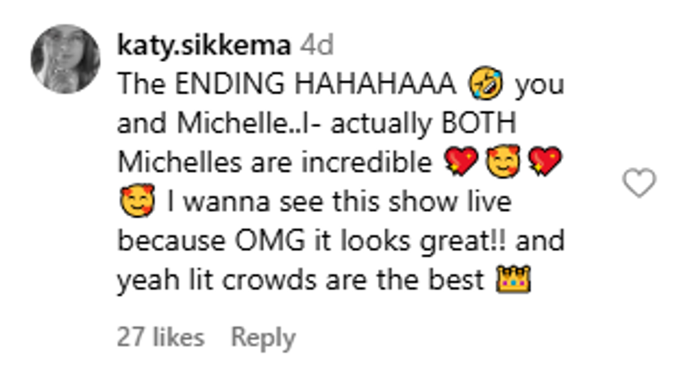 But this past weekend at a performance of Death Becomes Her on Broadway, where Destiny's Child's Williams plays Viola Van Horn, the two Michelles finally met each other off stage left. Their giddy reactions to meeting, from Destiny's Michelle bouncing on her tiptoes to Dawson's Michelle gesturing wildly, were everything.