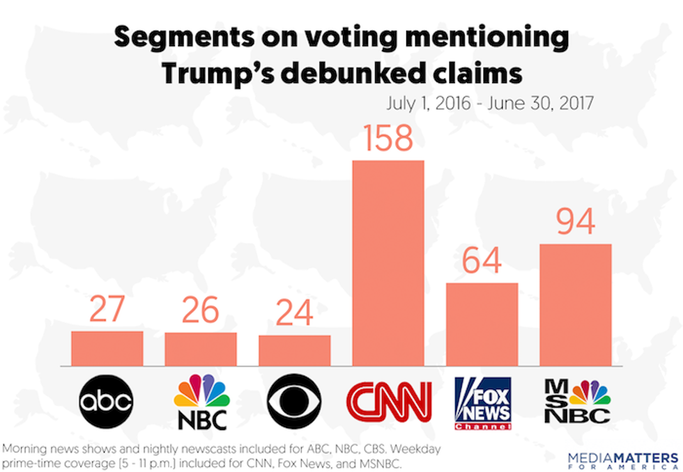Media Matters reported that 70.01% of news outlets were fixated on 2016 election coverage centering on Donald Trump's false claims of voter fraud and non-citizen voting, while only 8.9% covered segments on voters rights from July 2016 to June 2017.