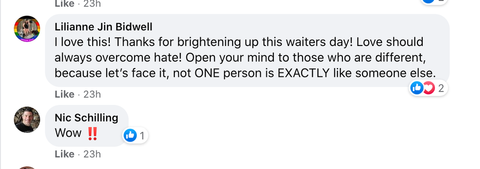 "On Tuesday evening we were able to surprise the server with the tip and to let them know that people love them for who they are and to not listen to those who just want to spread hate onto others."