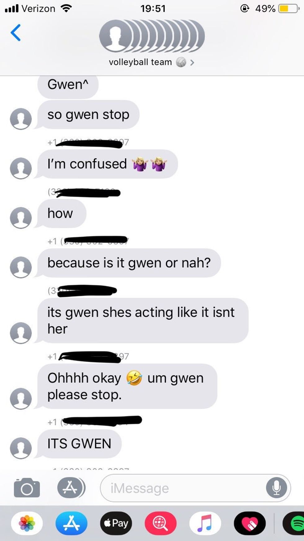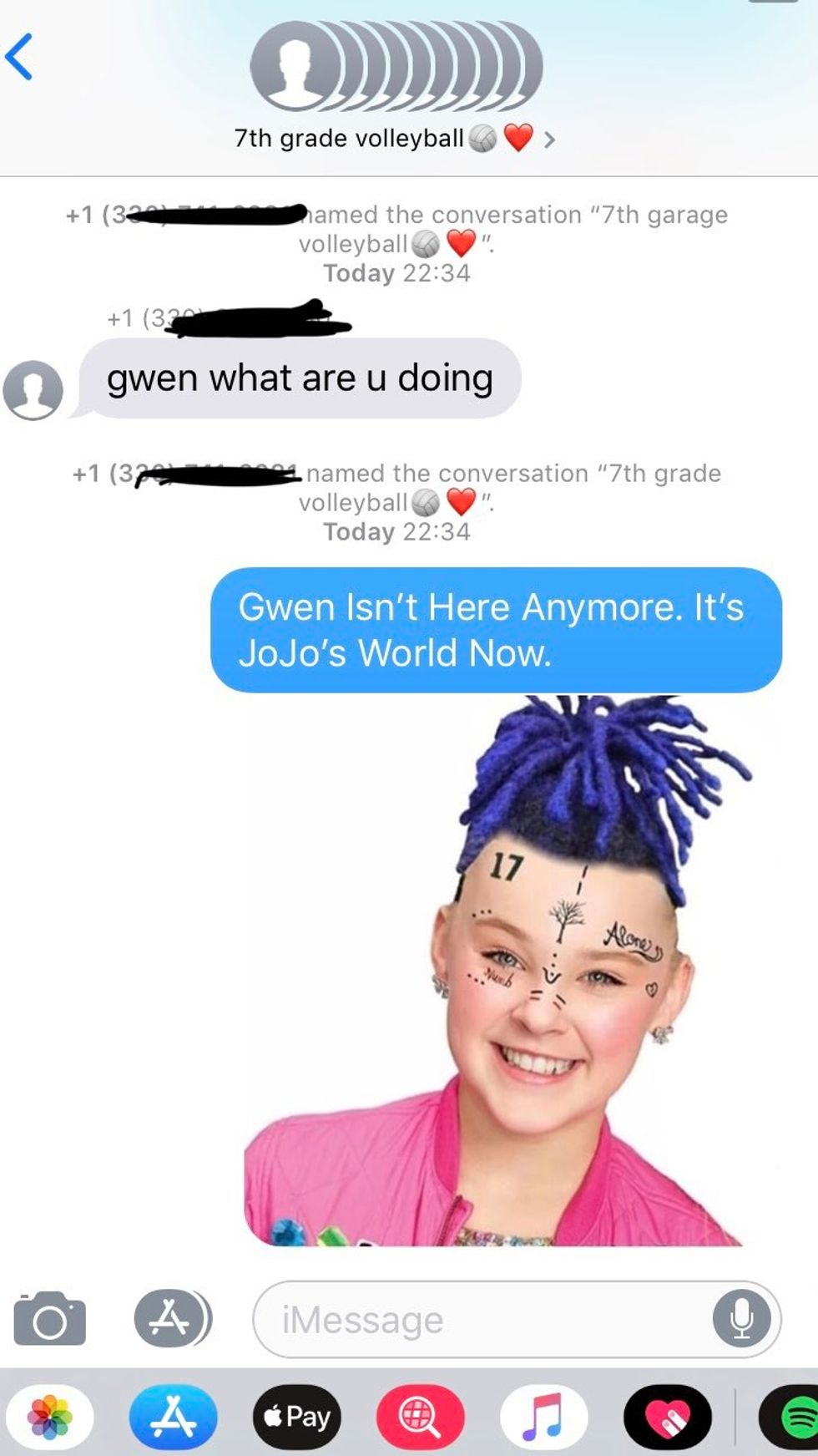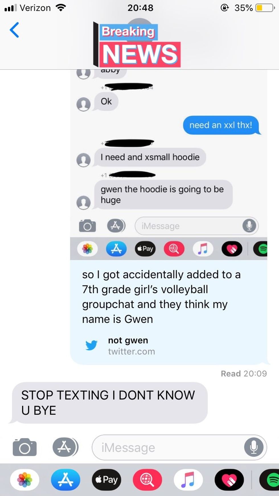 'Not Gwen' was added to a group chat of a 7th grade volleyball team. The players didn't realize their mistake for a little while, as Not Gwen requested an XXL hoodie in Gwen's name.