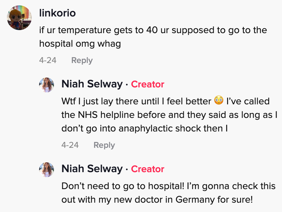 When users expressed concern for her alarmingly high temperature, Selway said she was told by the National Health Service (NHS) hotline—which is used in England—that unless she goes into anaphylactic shock, she wouldn't need to go to the hospital.