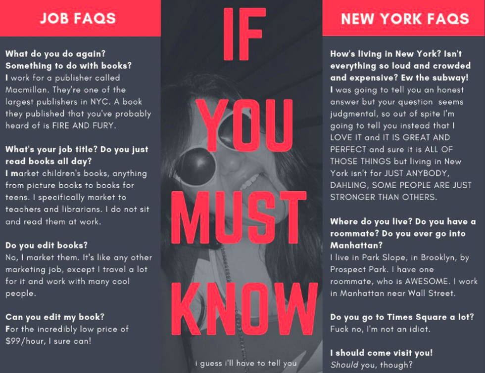 "How's living in New York?" reads one of the questions. "Isn't everything so loud and crowded and expensive? Ew the subway!"