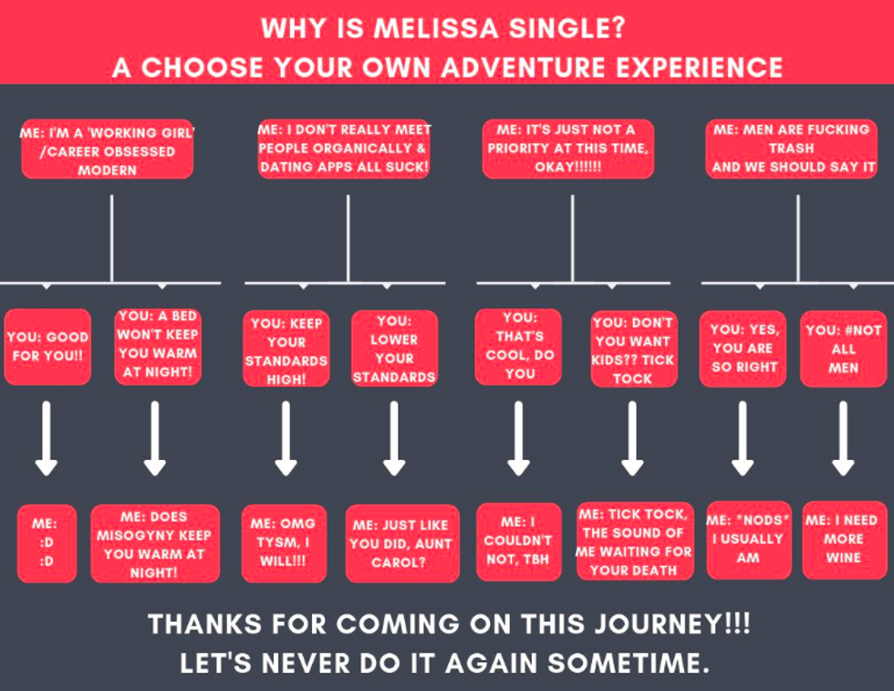 The flow-chart starts with four typical responses to "Why aren't you seeing anybody?" or "Why are you single?" and breaks down into further possible responses, one of which is positive and one negative, the negative ones mostly reacting to some messed up societal belief the asker holds about women.