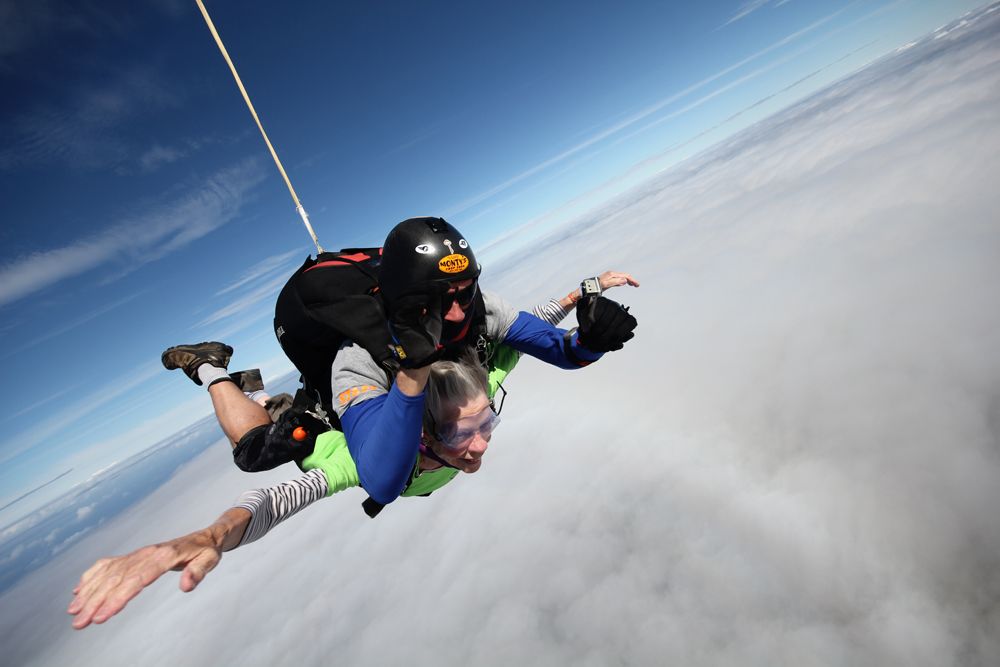 A fearless 80 year old celebrated her birthday by skydiving at 10,000ft, just months after an earlier attempt resulted in her making an emergency jump following a mayday call.