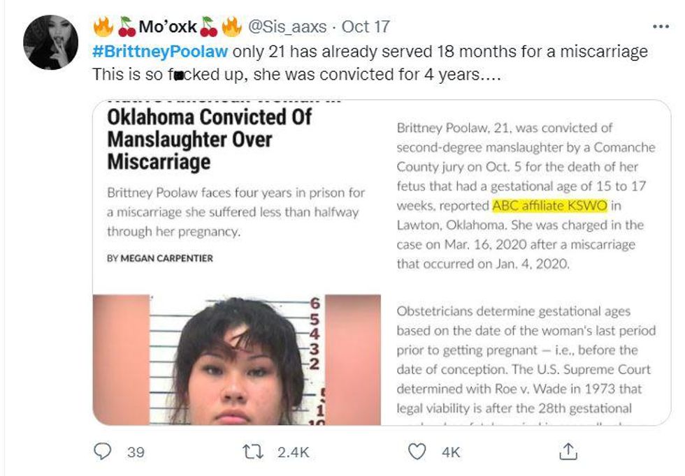 Brittney Poolaw is a member of the Comanche Nation and was sentenced to 4 years for having a miscarriage.https://twitter.com/pph_collective/status/1450930986489982978\u00a0\u2026— UAINE (ndnviewpoint) (@UAINE (ndnviewpoint)) 1634786911