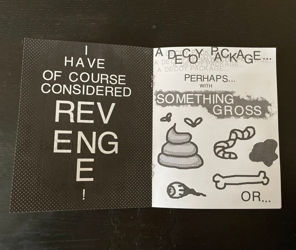 Eve Harms (@EveHarmsWrites) set up a decoy package on her porch which would reveal itself to simply be her zine "for my neighbor who steals my packages."