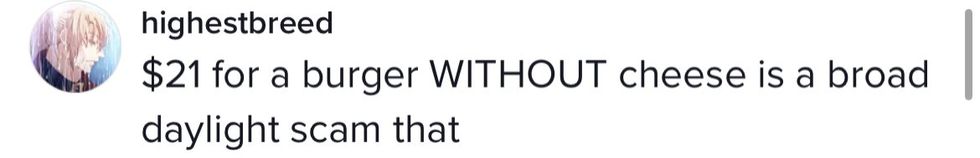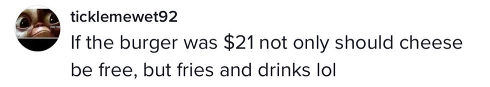 "I intended on paying twenty-one dollars for this burger, so paying three dollars extra for cheese was not worth it."