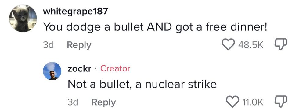 "I just paid the bill and walked out of the restaurant. So I texted him: 'the bill is taken care of, you should have gotten the cheese.' And then I blocked him."