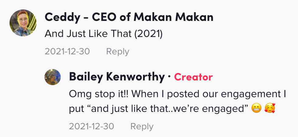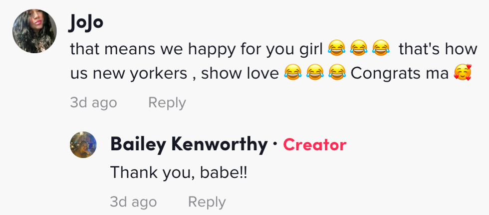 TikToker Bailey Kenworthy (@baykenz) yelled out the window, "I'm engaged, New York!" and was swiftly met with a passerby's response of "SHUT THE F**K UP."