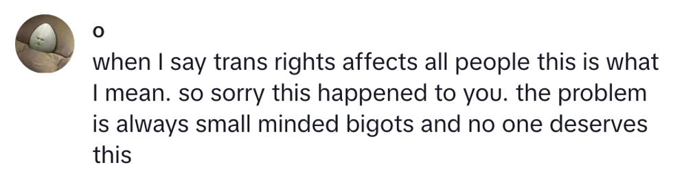 Her story about being harassed for minding her own business demonstrates how everyone is affected when the rights of marginalized communities, specifically transgender youth, are being taken away by conservative lawmakers catering to the religious right's fixation on social issues.