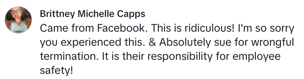 "I just.... I don't understand. I was the one followed into the bathroom and I was the one who felt threatened and unsafe.... so I get fired for it? Does this make sense to anyone?"
