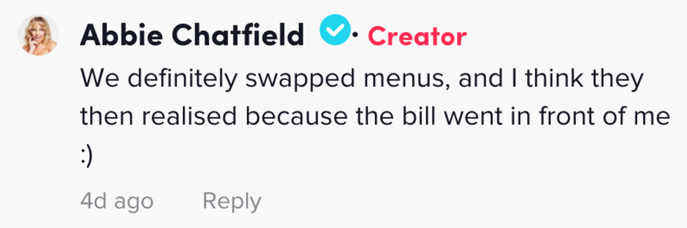 Chatfield said in the comments she and her boyfriend swapped menus.