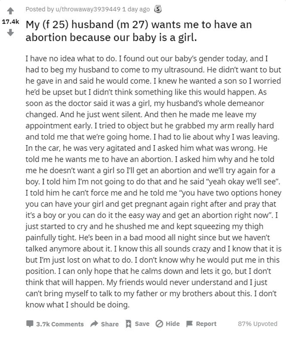 "I knew he wanted a son so I worried he'd be upset but I didn't think something like this would happen. As soon as the doctor said it was a girl, my husband's whole demeanor changed. And he just went silent. And then he made me leave my appointment early."