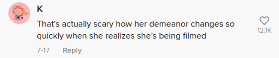 At the end of the video, the woman realized she was being recorded and changed her demeanor. But that didn't stop her from having a choke hold on her dog as she held the leash too tightly, reflecting her anger.