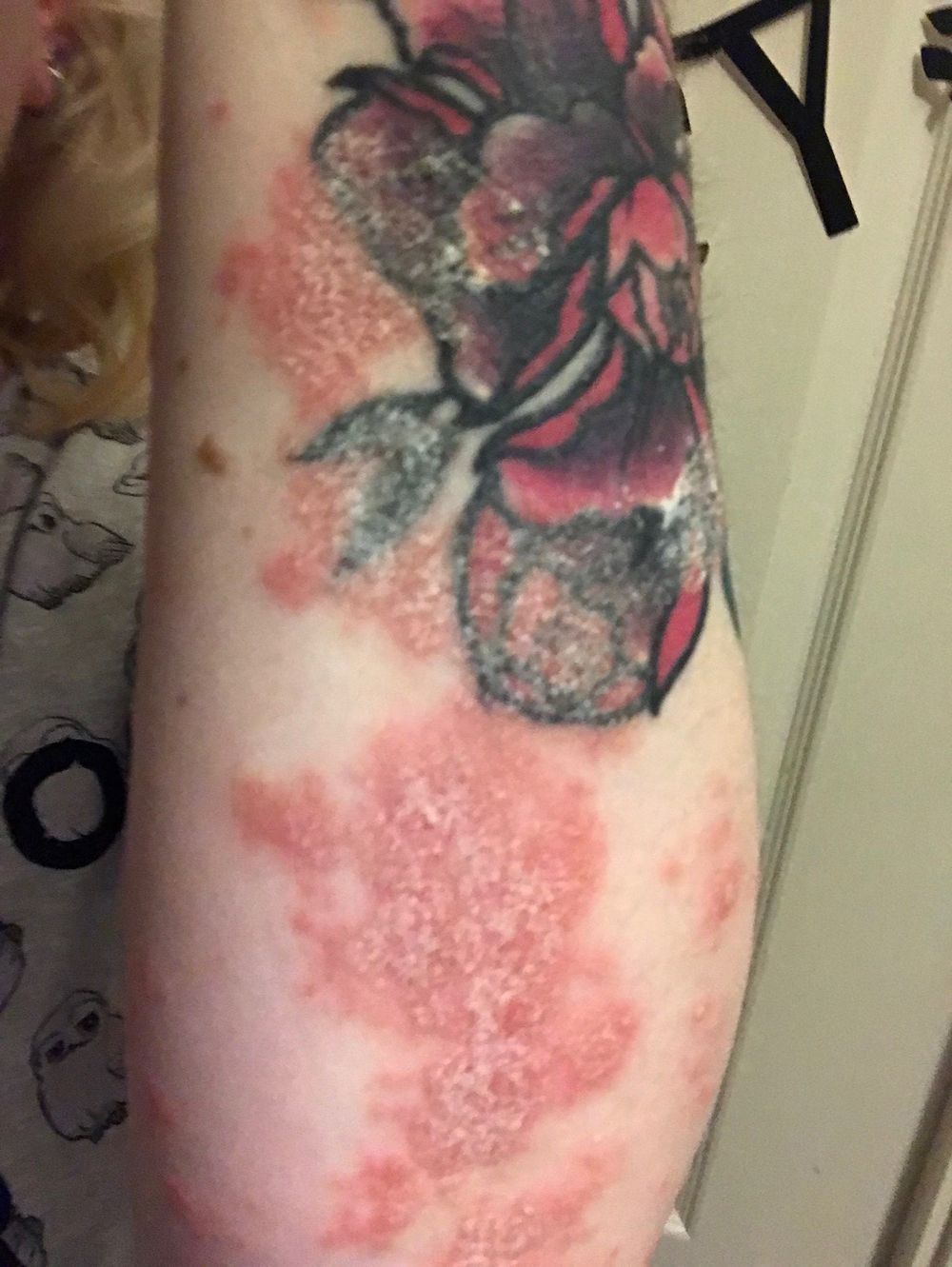 A mom who assumed her dry scalp was dandruff has told of how she ended up with psoriasis so severe it coated her entire body and turned the rose tattoo on her arm into an “unrecognizable, blurry mess."