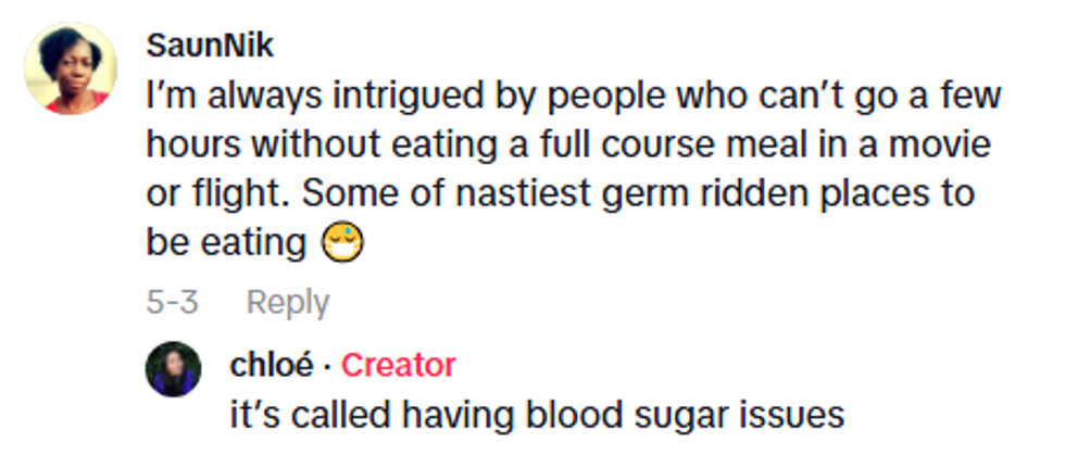 TikToker @chloe.ggray decided that she had it all figured out when she realized that, between balancing her blood sugar and tracking her macronutrients, chicken would be the perfect food choice for her next flight.
