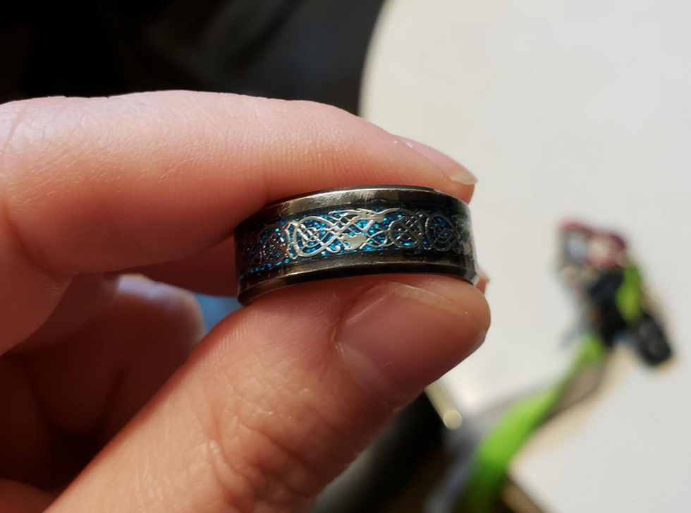 For those who've inquired about the ring's appearance, the OP shared this photo of the Celtic-style dragon ring that she previously posted on Imgur.