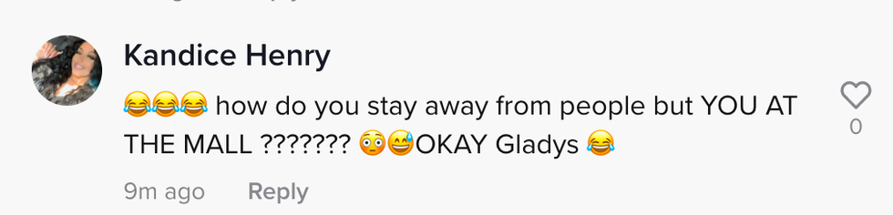 @camocamille then pointed out "Gladys" wasn't wearing a mask and accused her of not caring about Covid-19.
