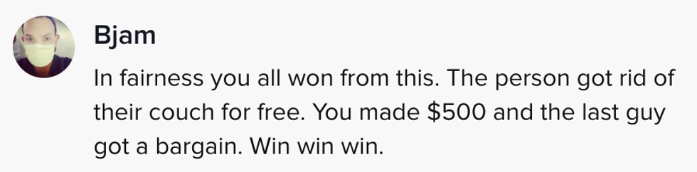 All was looking good when she quickly received a reply from some guy who offered her $500 for the couch. Jules was thrilled, got the thing off her hands and walked home with a nice windfall.