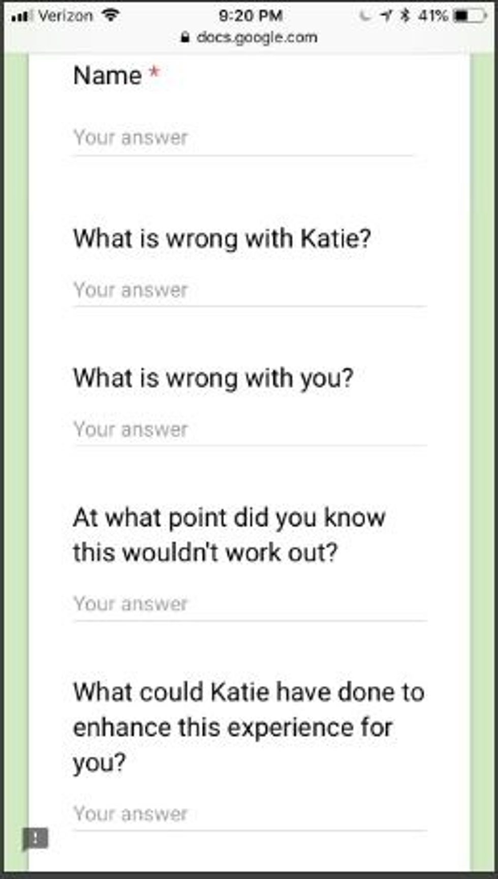 A Twitter user named Abby decided to share her friend Katie's exit survey. What exit survey? The one Katie gives out after ending her relationships!