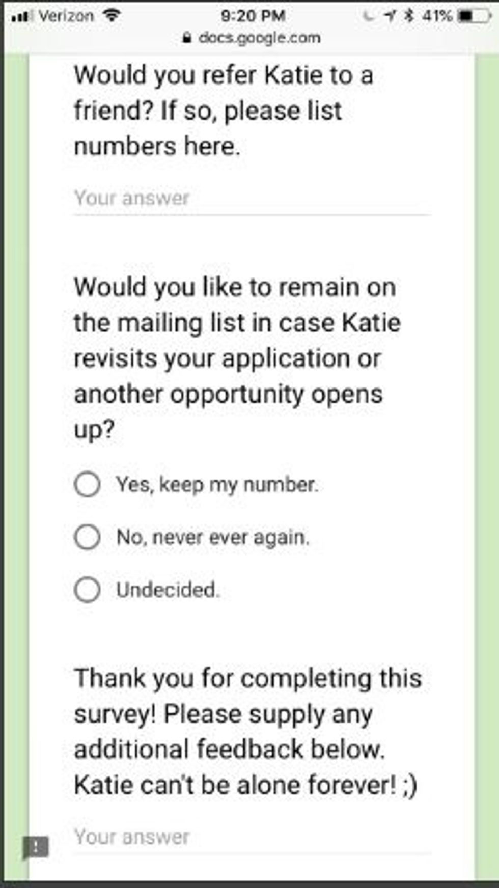 There's this girl i know who sends an exit survey to every guy she casually AND seriously dates.