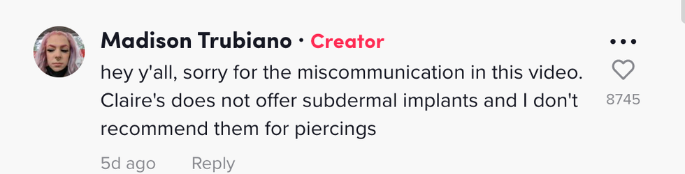 Trubiano later clarified in the comments section she was joking about where she got the implants done, nor would she recommend Claire's for piercings or the like.