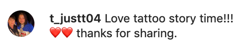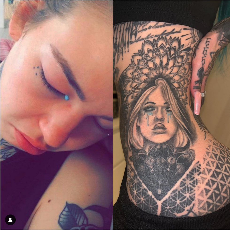 In a juxtaposed photo in her post, she showed another inking procedure that was more of a success, which was that of an illustration on her ribs depicting a woman with blue tears streaming out of her eyes.