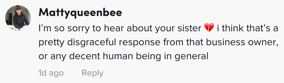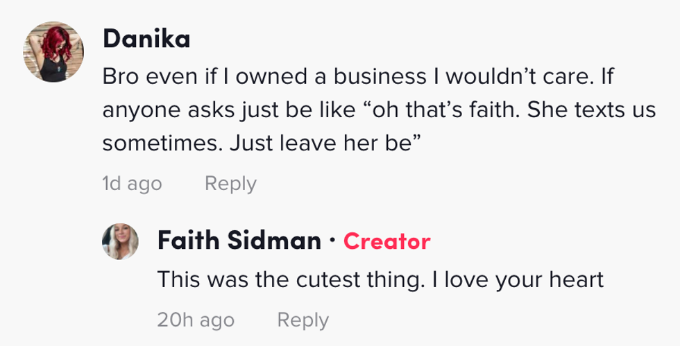Sidman posted a follow-up video in which she said she didn't expect the video to blow up, and she doesn't know the name of the business nor would she feel comfortable sharing it if she did.