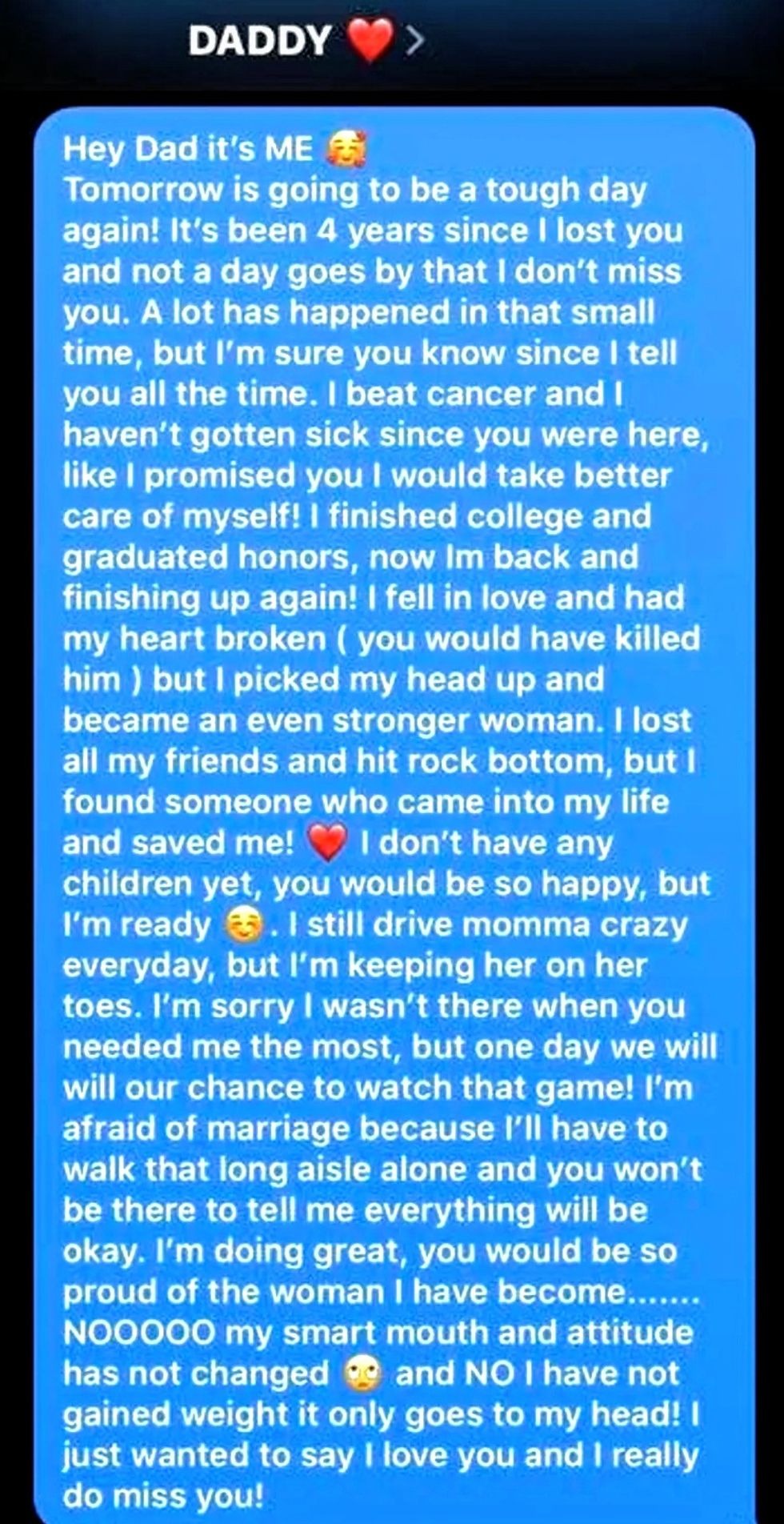 In her text message, Patterson shared details about the things she'd gone through since her father's passing: broken relationships and friendships, her battle with cancer, growing up and getting a dog.