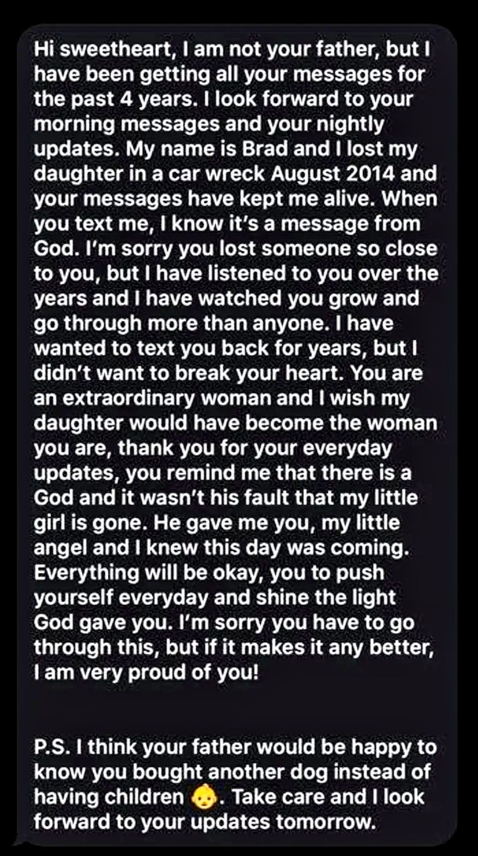 Chastity Patterson, age 23, can attest to this since, after texting her father every day for four years as a way to cope after his death, she received a surprise message from a stranger.