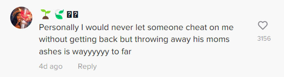Sara, of @starringsaraa on TikTok, raised such a question recently after one of her videos went viral and generated a loy of feelings. In it a woman claims to be so furious her boyfriend was cheating on her, she decided to throw his mother's ashes and urn into a nearby river.