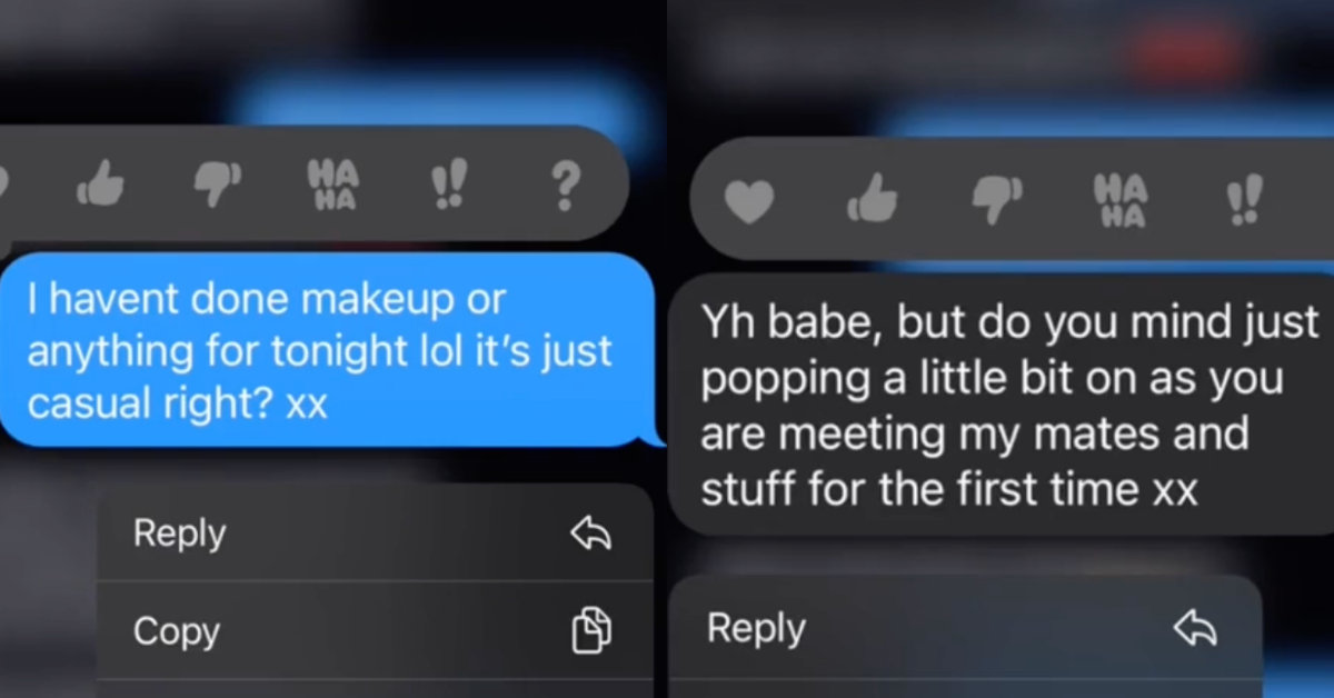 The conversation started out harmless enough with the boyfriend saying, “Hey hey babe. Have you started getting ready for tonight yet?”