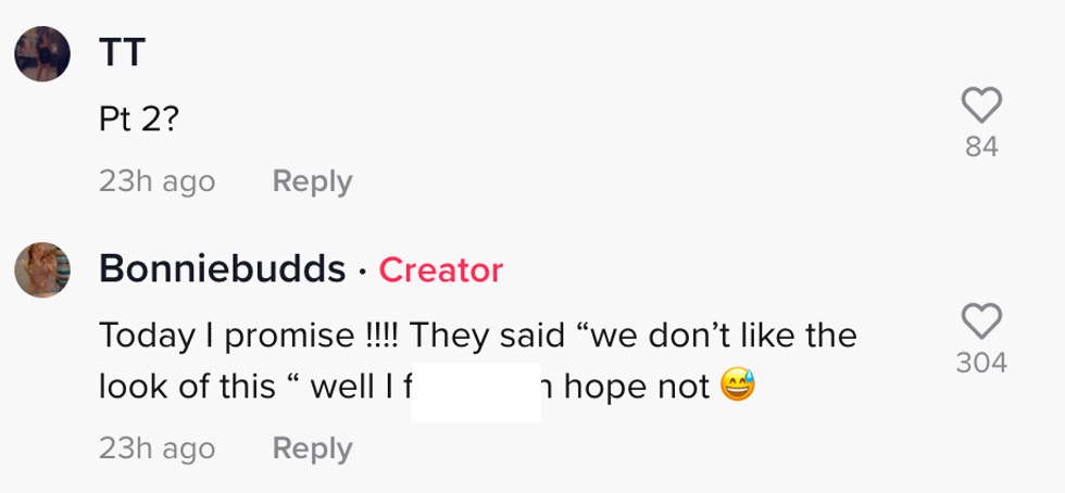 But it doesn't appear a follow up video will be on @bonniebudds_ page any time soon, as she revealed in a subsequent comment she has been temporarily banned from posting on TikTok.