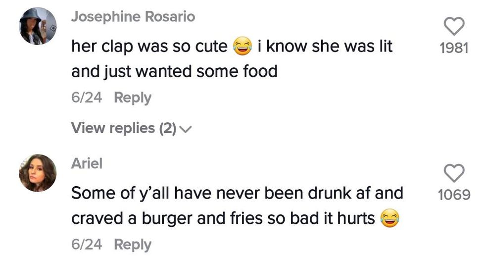 It cuts out with her still trying to talk her way into a combo meal with the employees totally caught off guard by her particular brand of McTipsy.