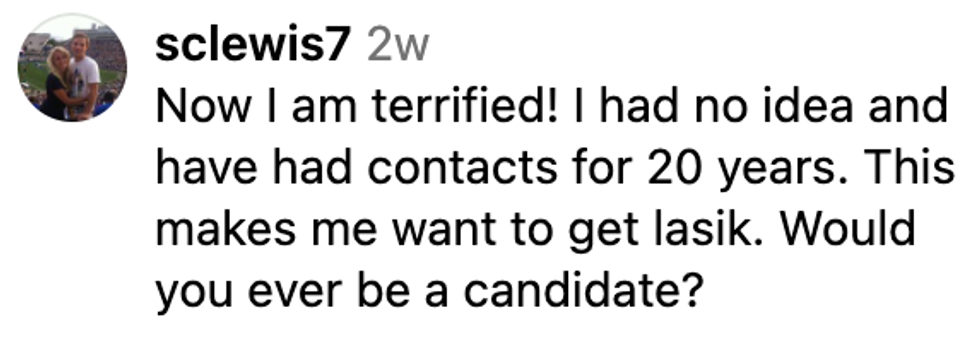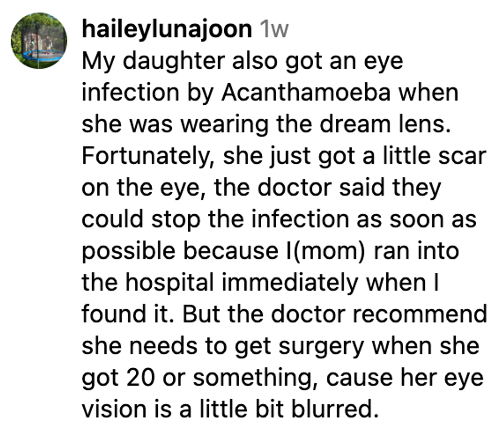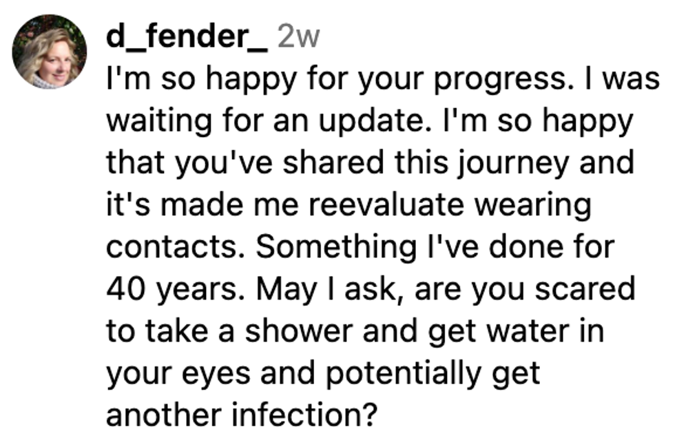 "I had been wearing contacts since I was 12 and no eye doctor I had ever been to told me to not shower, swim, or hot tub in my contacts. I always washed my hands before handling them, never slept in them, replaced my contact case every 2 month, and didn’t overwear my contacts (I wore monthlies and replaced them every month)."