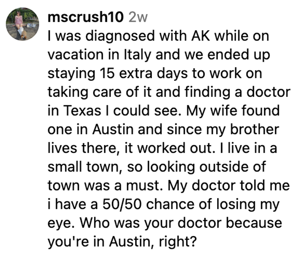 "On July 3, 2023 I was diagnosed with Acanthamoeba Kerititas, a parasite that destroys your cornea. I got it from showering in my contacts in Austin, Texas."