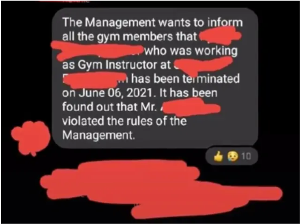 "The Management wants to inform all gym members that [man's name redacted], who was working as a Gym Instructor at [gym's name redacted], has been terminated on June 06, 2021. It has been found out that Mr. [man's name redacted] violated the rules of the Management."