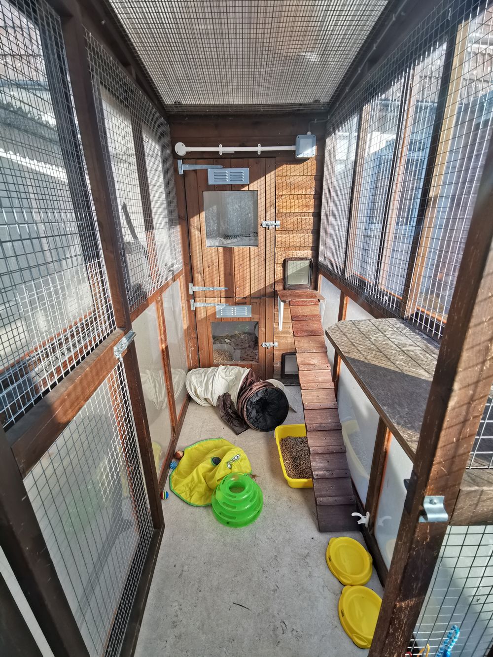 In August, Cats Protection built an outdoor pen for Nikita in her back garden, which includes an insulated cabin with plenty of soft bedding and a run, accessed by a cat flap, where the cats can stretch their legs and play.
