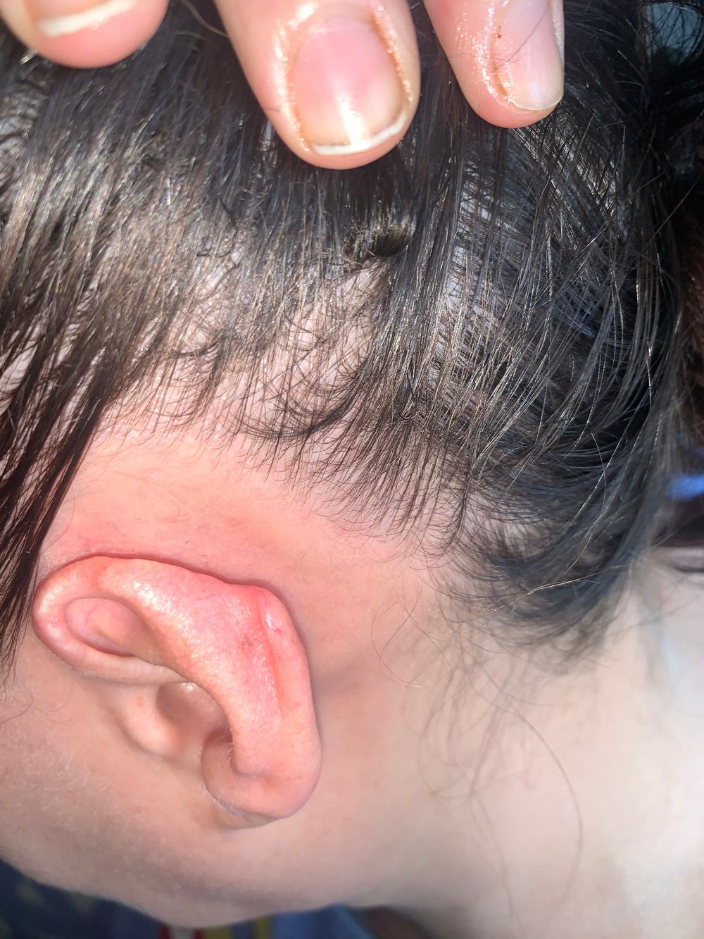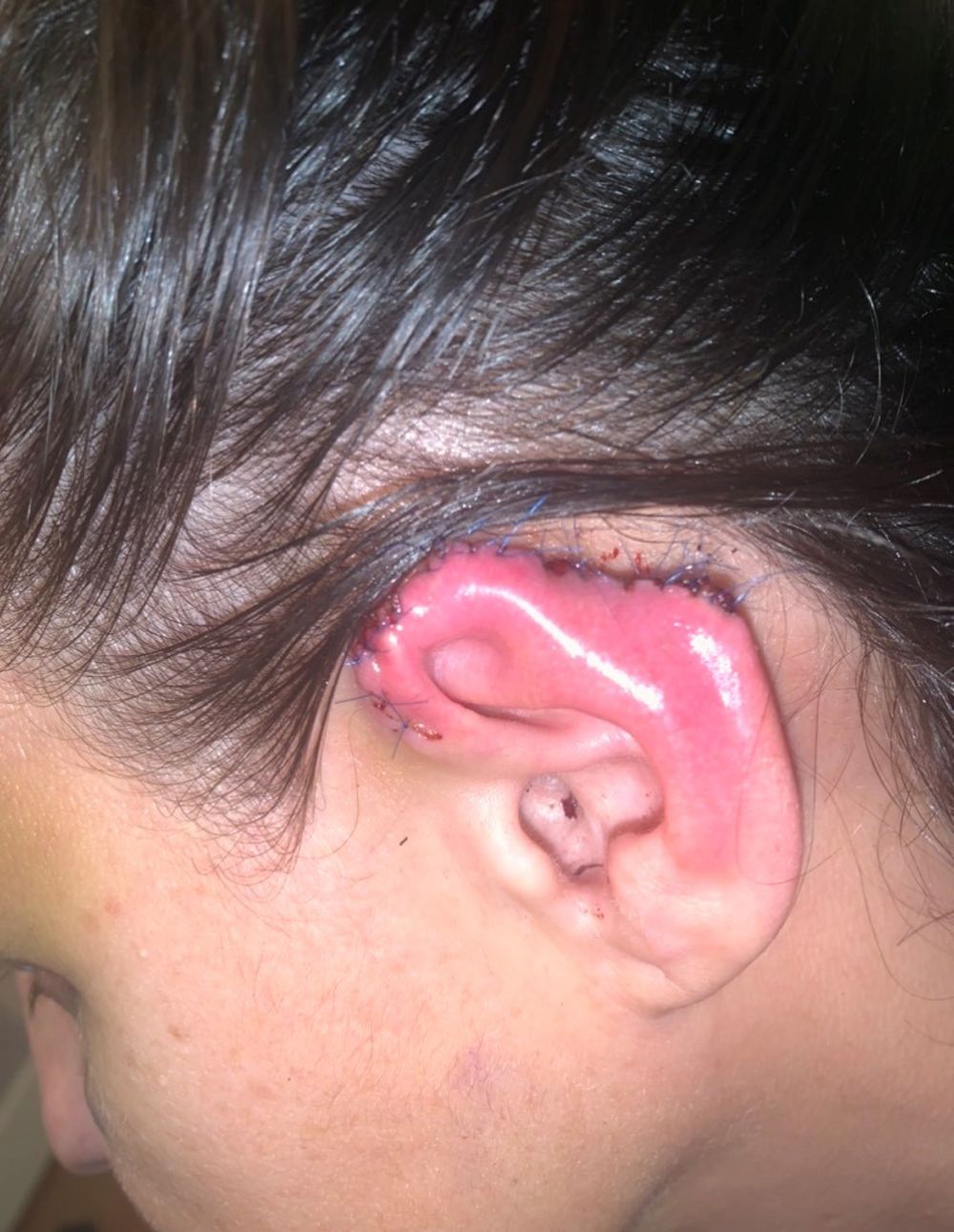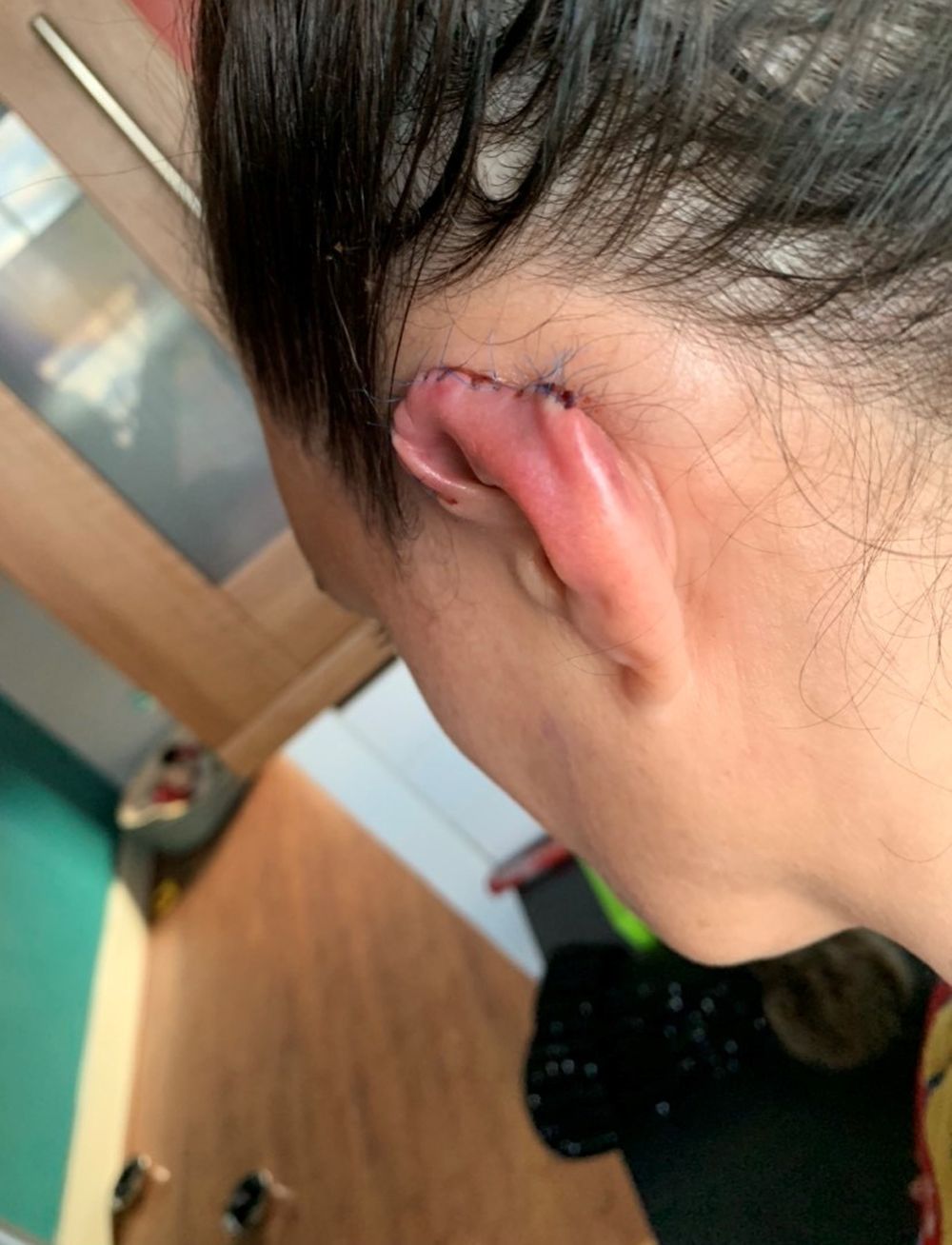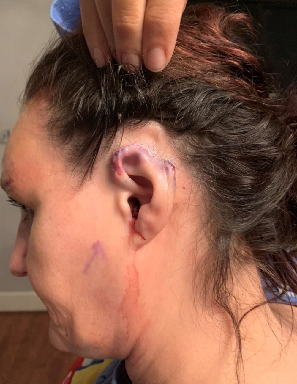 It was too late to reattach the portion of her ear that had been torn away, so after a night in hospital, she had 19 stitches to close the wound and was sent home.