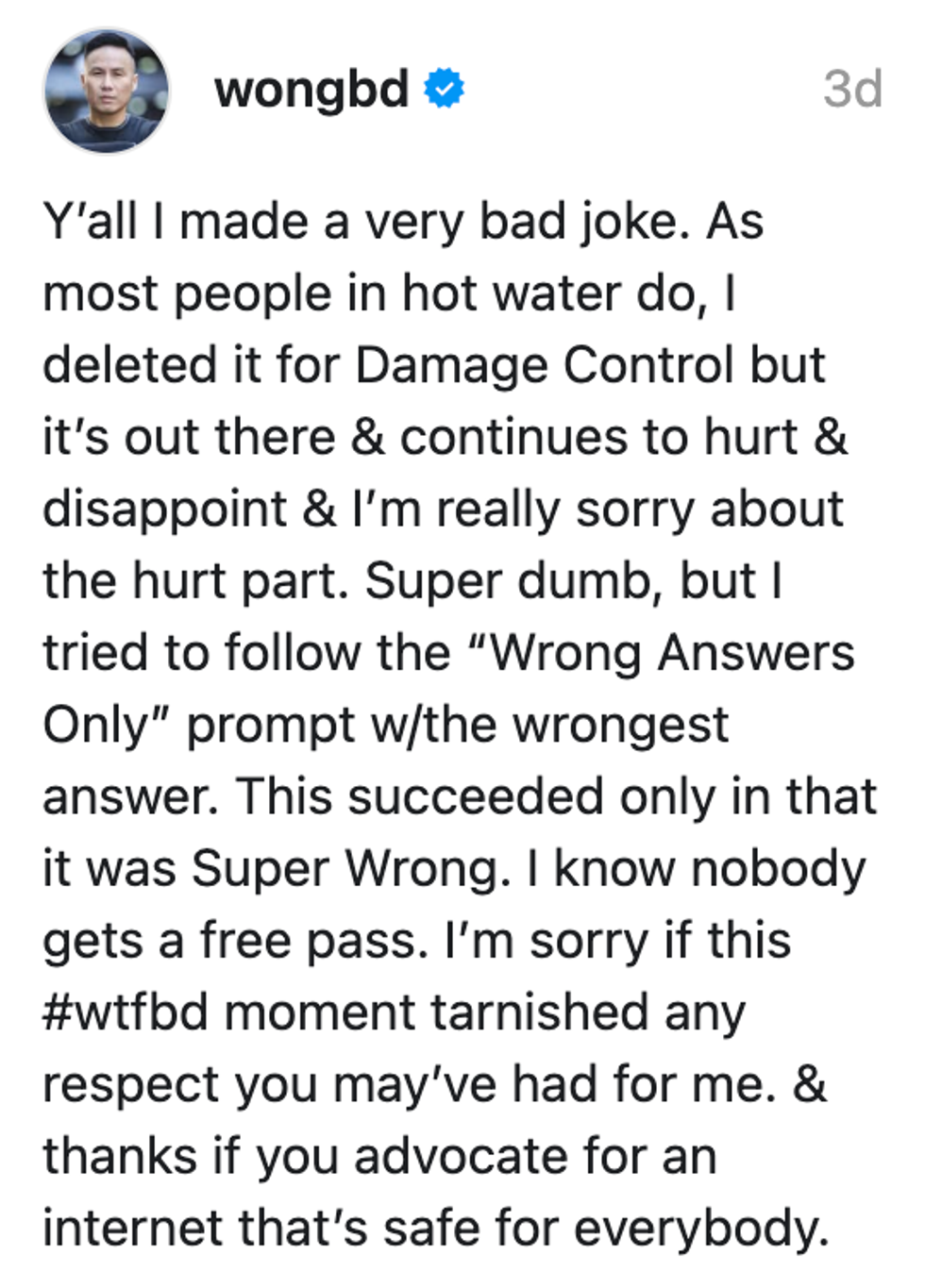 Wong's apology comes at a turbulent time when discussions about accountability, the impact of public influence, and the responsibilities of those with platforms that could cause the most harm are more important than ever.