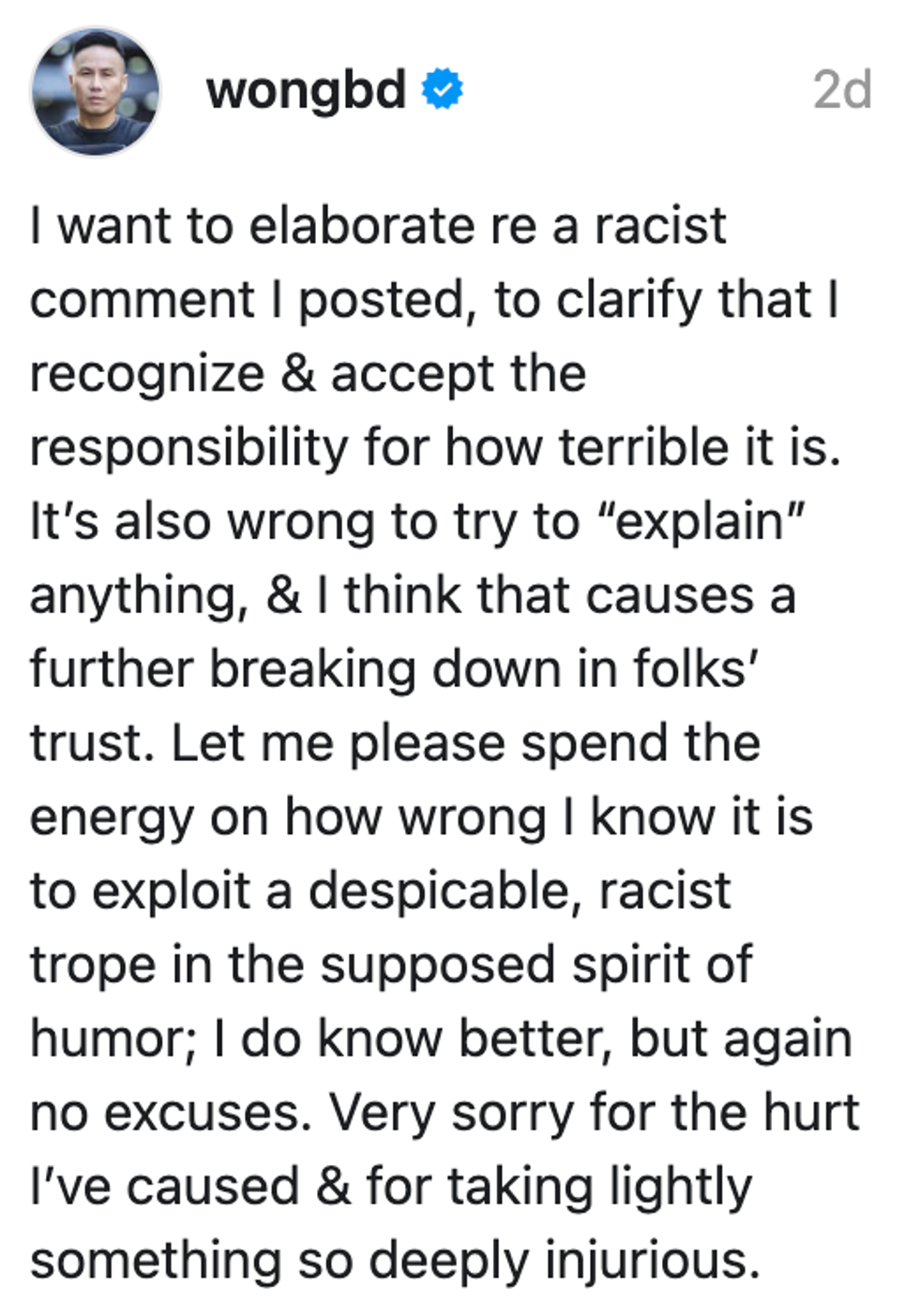 Although Wong concluded his apology by emphasizing that he understands the seriousness of his words—saying, “No excuses”—it remains to be seen whether black audiences will accept his apology. His statements recognize that even a moment meant as humor can reflect and reinforce deeply harmful ideas.