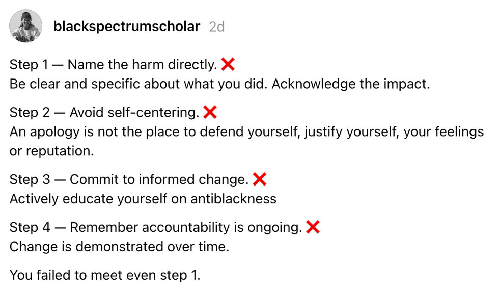 Members of the Black community have also highlighted that social media apologies cannot repair the harm caused by racism, and they should not feel obligated or pressured to forgive. As several individuals pointed out, those who have been targeted by racist stereotypes have the right to choose how, or if, they wish to respond to an apology.